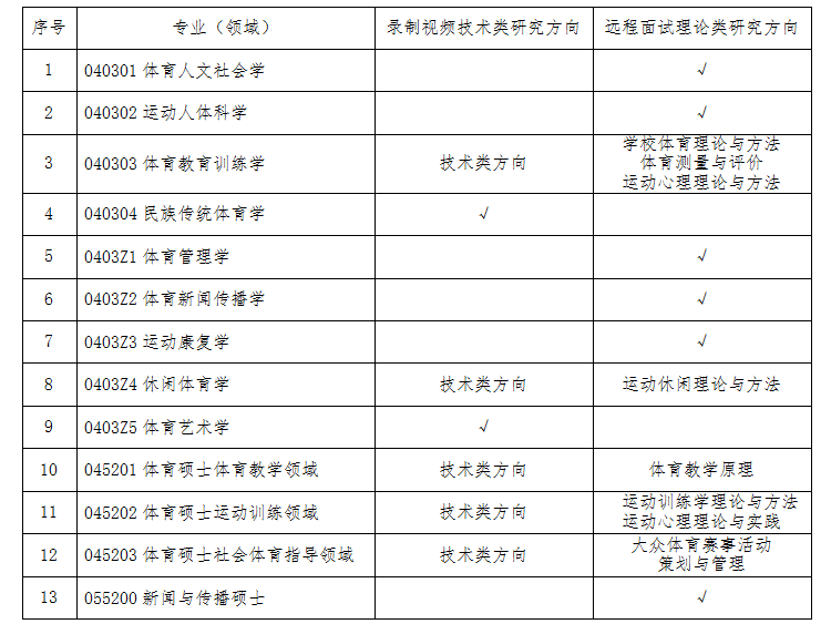(1)技术类专业(方向)复试。采取录制技能视频上传系统,考官根据考生的运动技能水平进行综合独立评分。满分100分,成绩以30%计入录取总成绩。