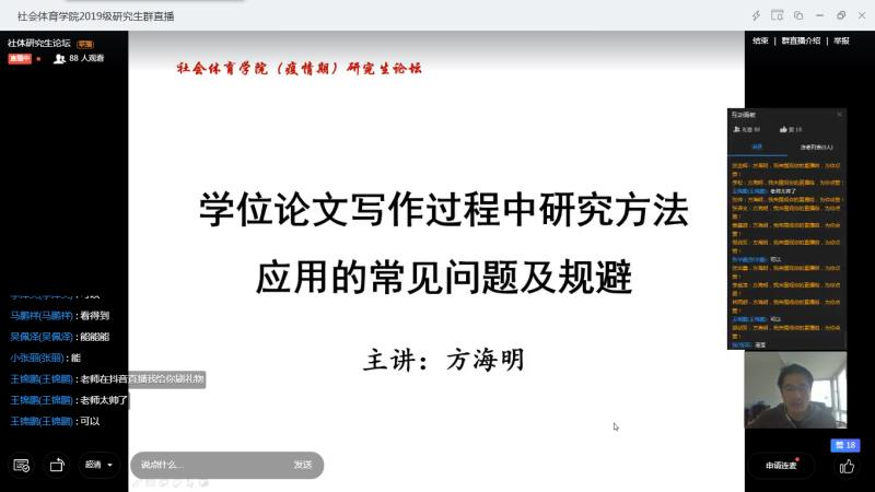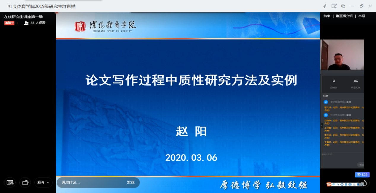 在全国上下团结一心抗击新冠疫情的背景下,社会体育学院积极响应倡议号召,精心组织安排,围绕“学术论文写作常见问题”举办线上学术沙龙。赵阳、方海明、杜江、宋学岷4位导师分别以《论文写作过程中质性研究方法及实例》《论文写作过程中研究方法应用的常见问题及规避》《美国学习经验交流》《教育游戏的思想渊源和发展脉络》为题进行阐述。有针对性的向学生讲解学术论文写作中的研究方法等问题,鼓励研究生们充分利用居家时间广泛阅读文献,主动开展科学研究。在互动环节,学生们结合沙龙中的所思所感和平时的学习科研经历,积极与主讲教师互动探讨。生动精彩的线上学术沙龙活动,受到了学生们的热烈欢迎。