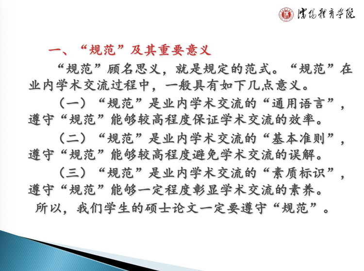 在沈体硕士论文的“形式规范”及盲审问题修正中,郝庆威教授重点讲授了诸如基本概念、序号、图表等规范及修正办法。