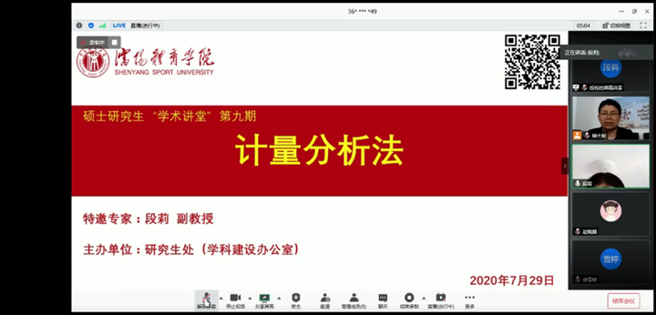 2020年7月29日下午1:30,“学术之路”之学术讲堂第九期活动通过腾讯会议+腾讯直播的形式如期举行。此次活动由运动人体科学学院承办,邀请了中国医科大学附属第一医院段莉副教授做题为“计量分析法”的专题讲座。运动人体科学学院张新安院长主持了此次活动,硕士生导师和300余名研究生通过腾讯直播参与了此次讲座。