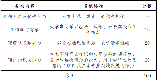 每生一般不少于20分钟,面试小组对考生进行综合考察,并向考生当场公布面试成绩,面试小组专家现场独立评分。面试内容和标准如下: